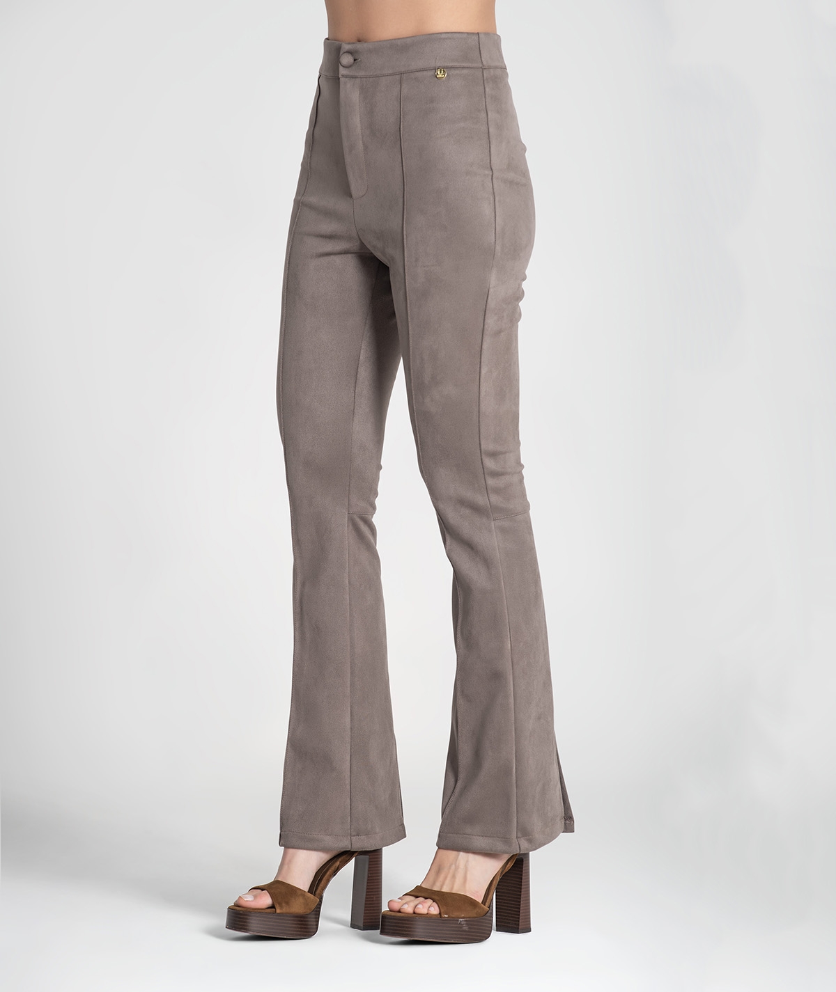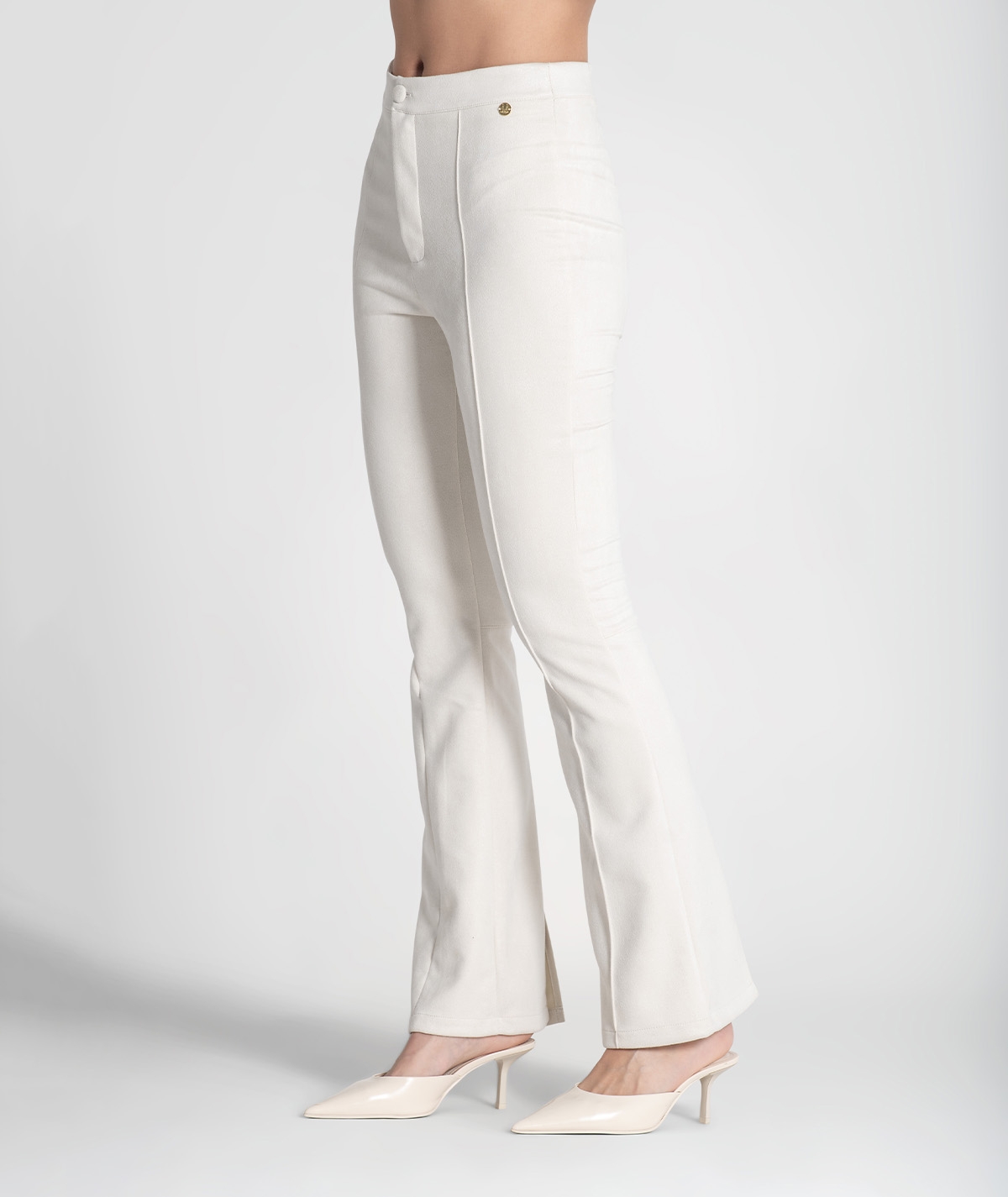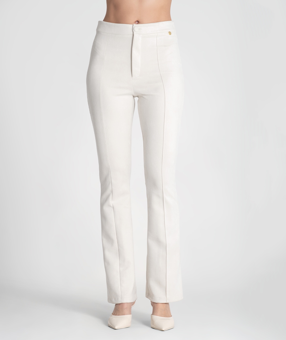 Calças boca de sino. Aperta na frente com fecho e botão.