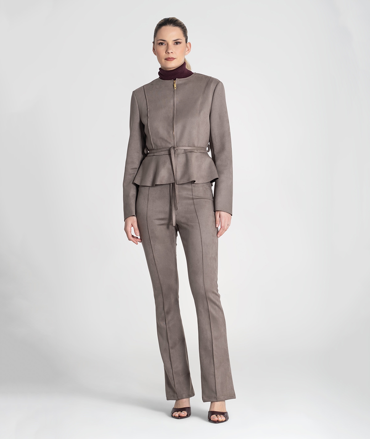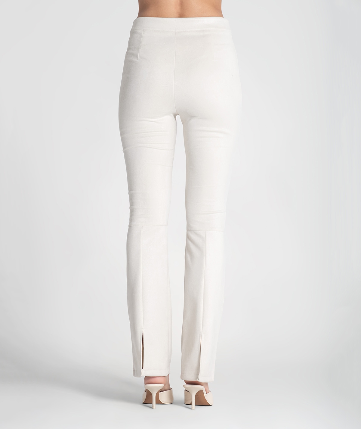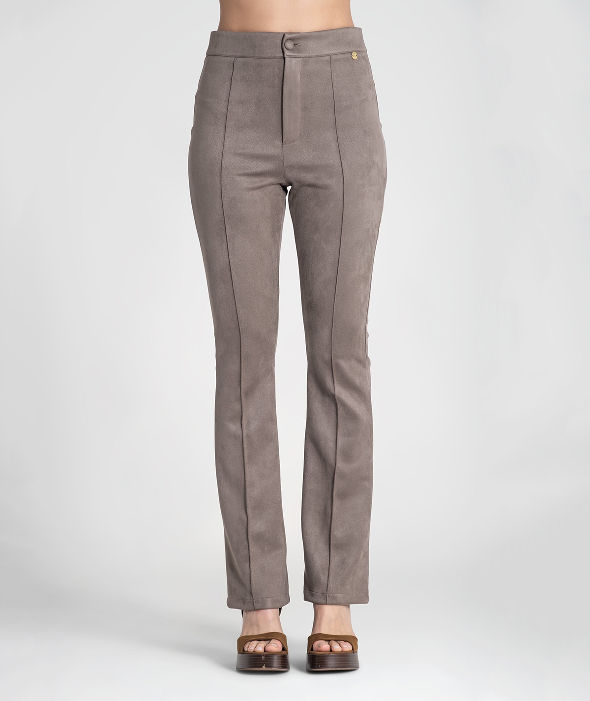 Calças boca de sino. Aperta na frente com fecho e botão.