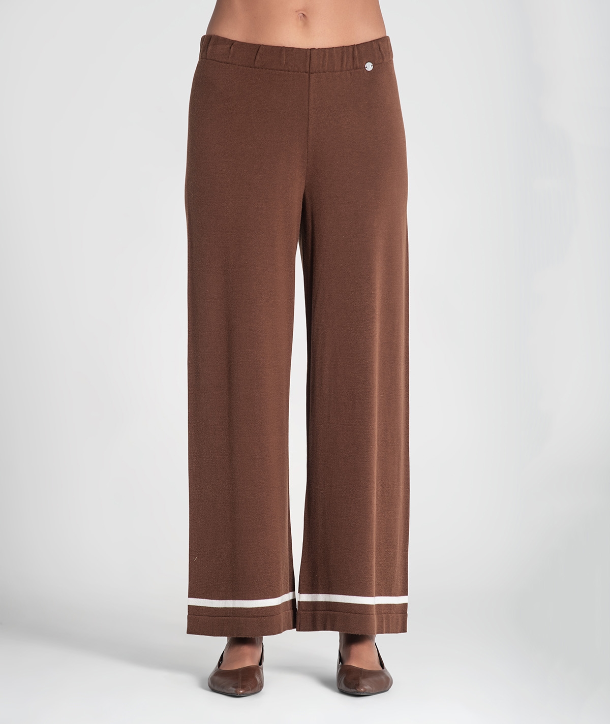 Calças básicas com risca no fundo. Ajusta na cintura com elástico.