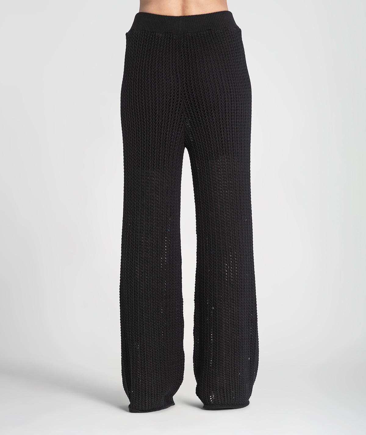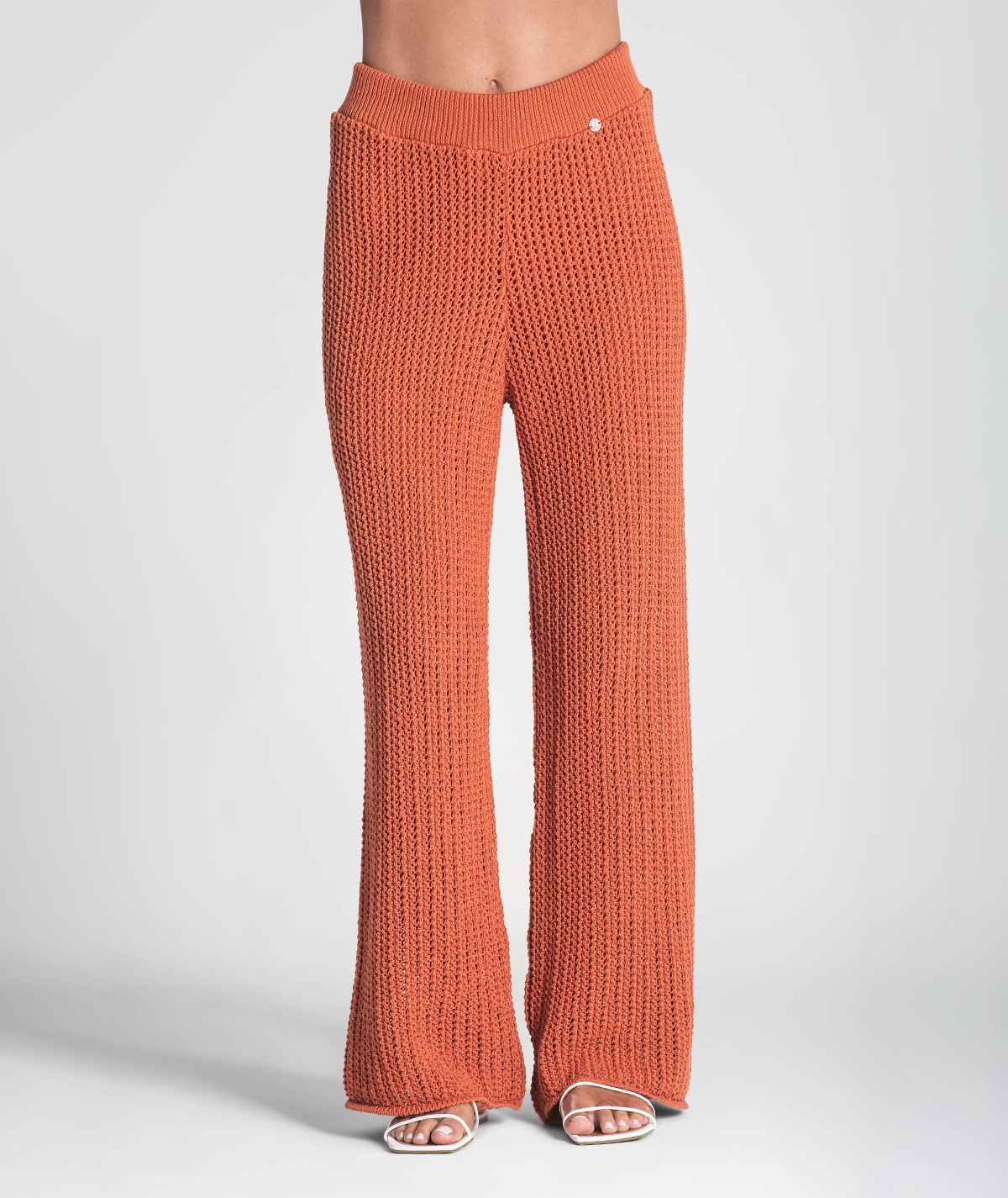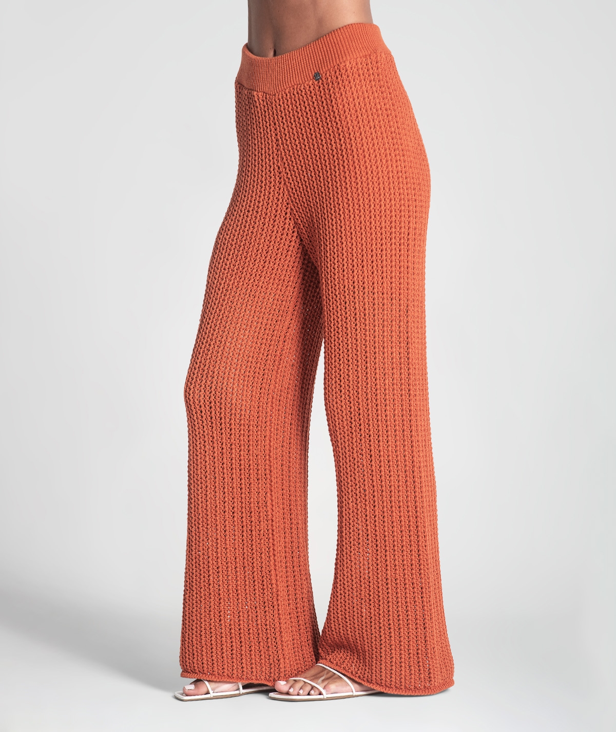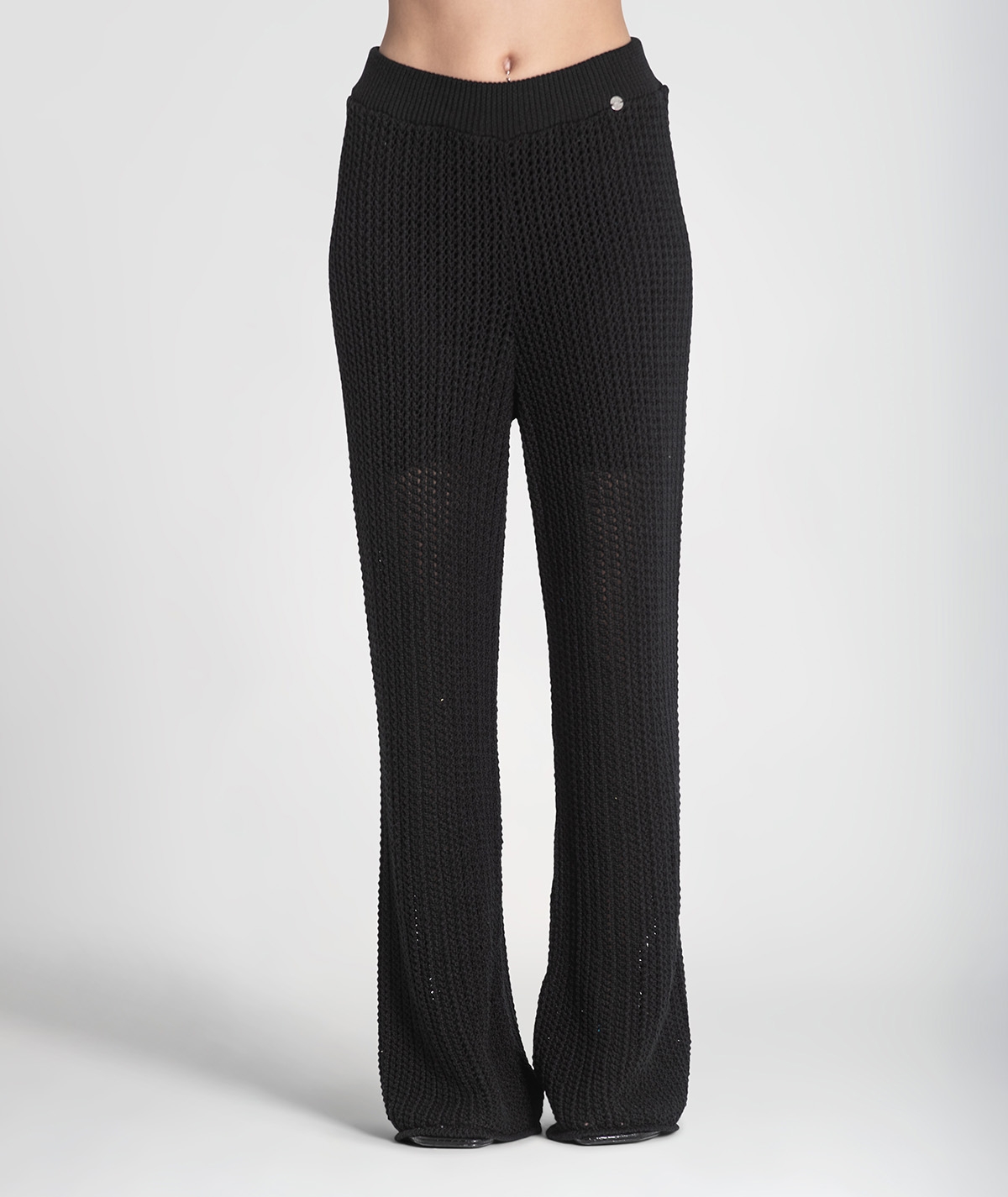 Calças largas perfuradas. Ajustam na cintura com elástico.