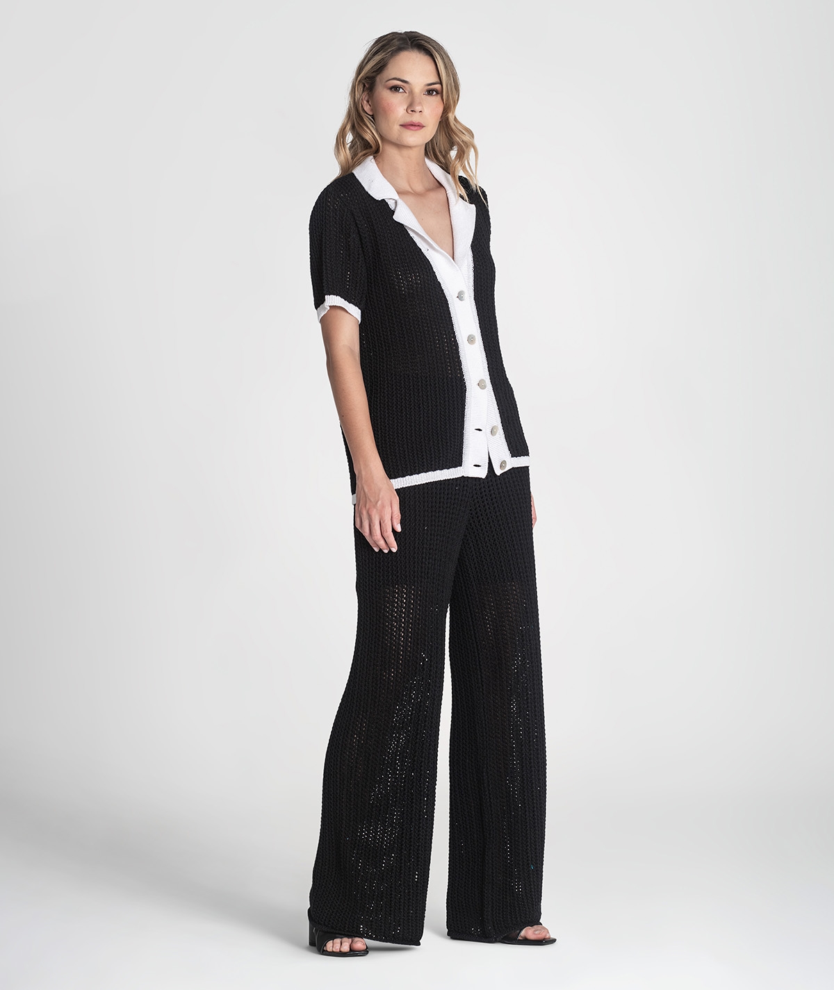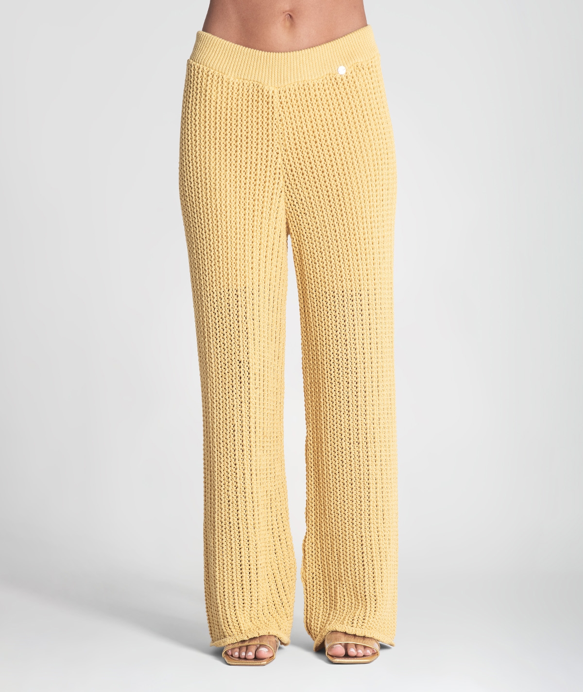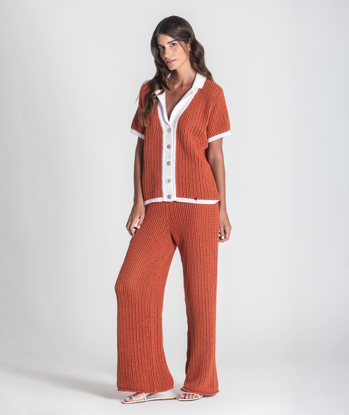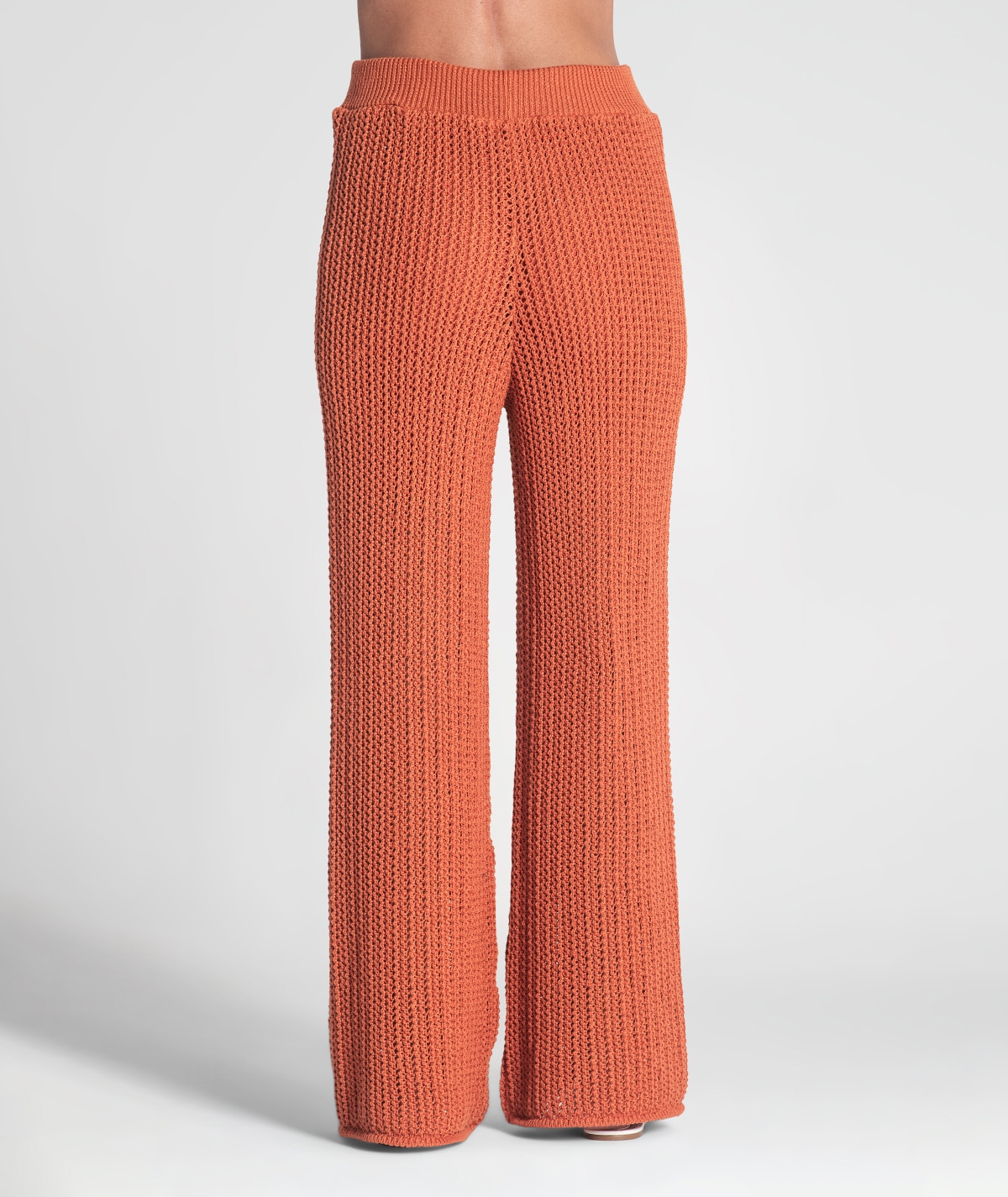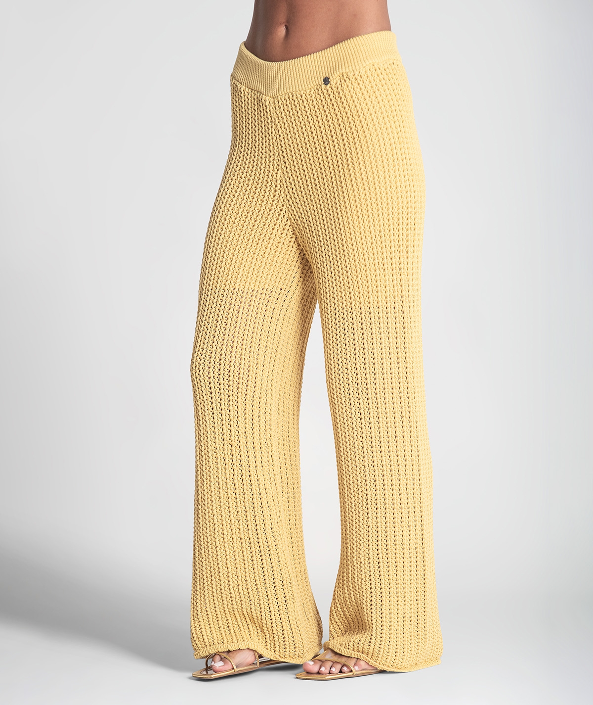 Calças largas perfuradas. Ajustam na cintura com elástico.