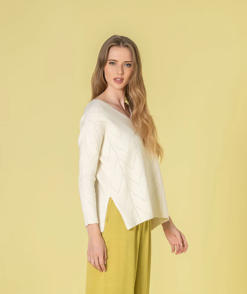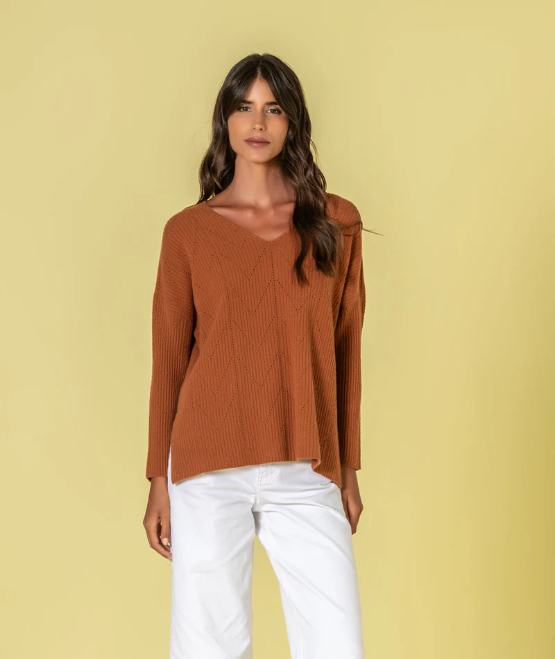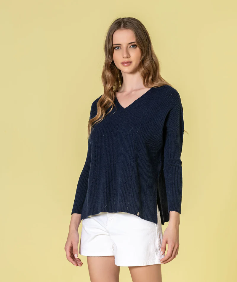 Camisola decote em v com perfurados.