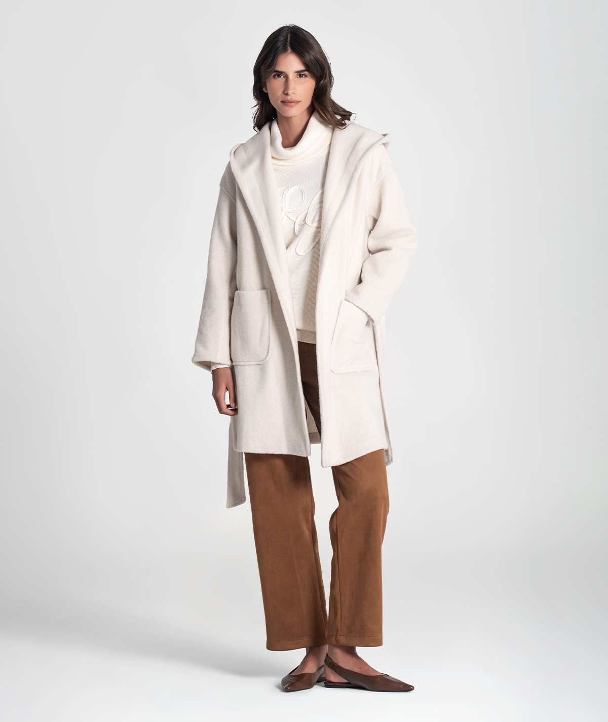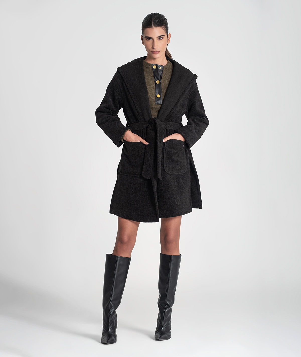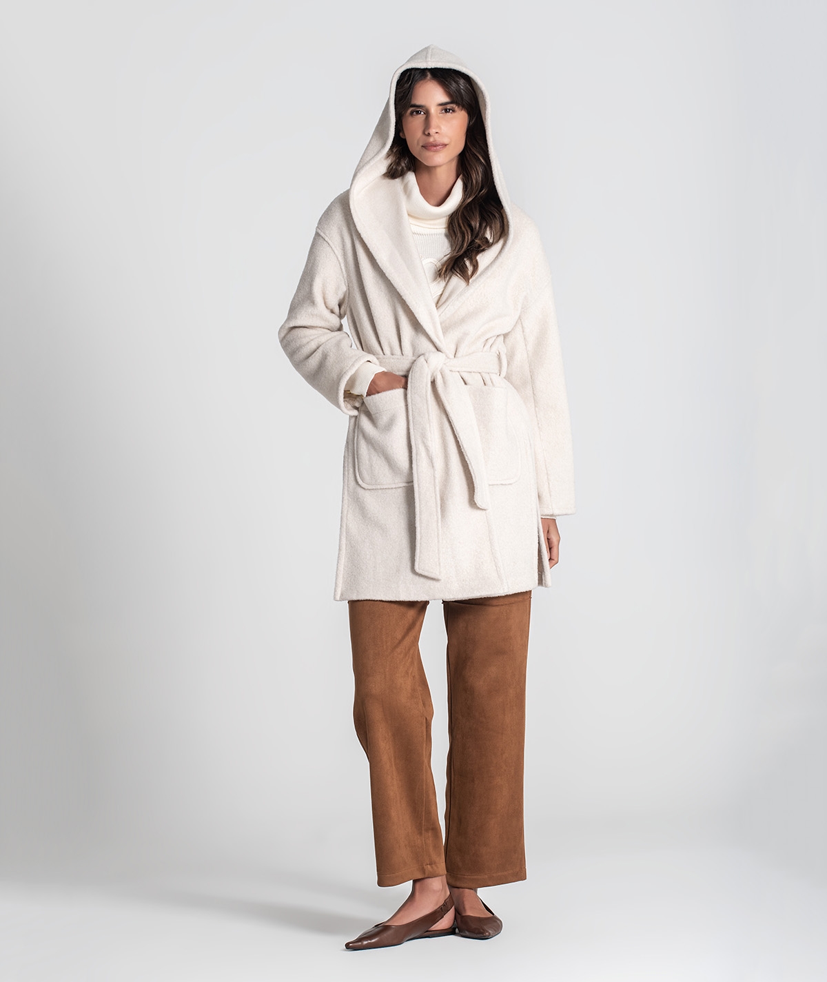 Casaco com bolsos na frente e capucho, ajusta com cinto amovível.