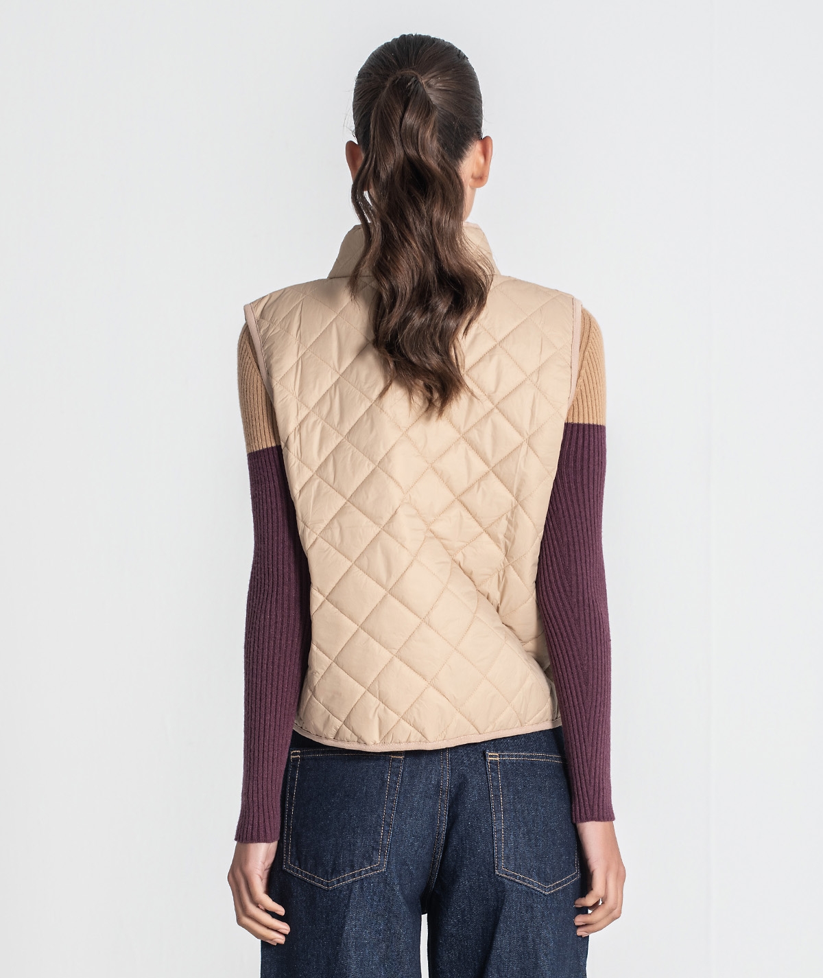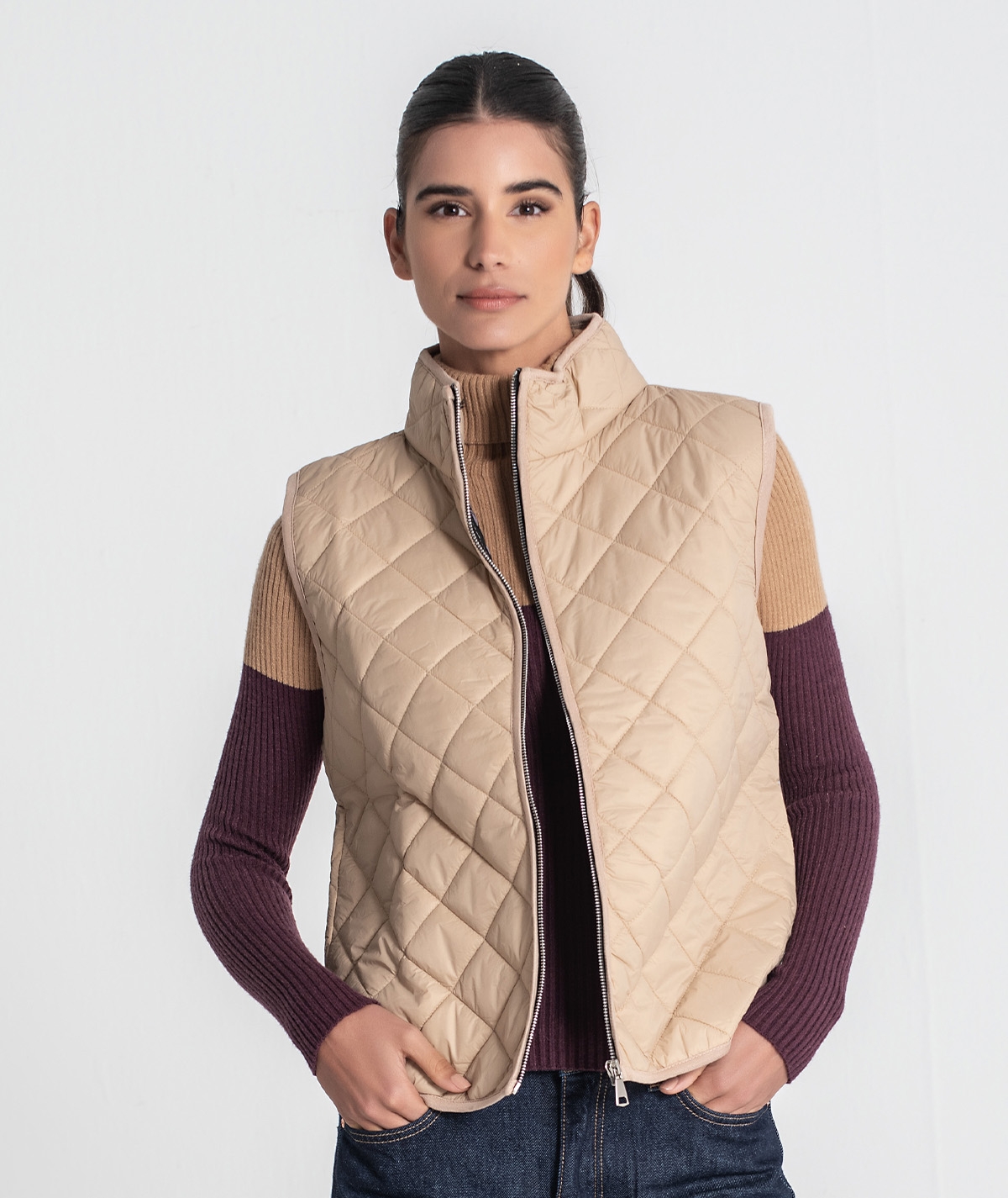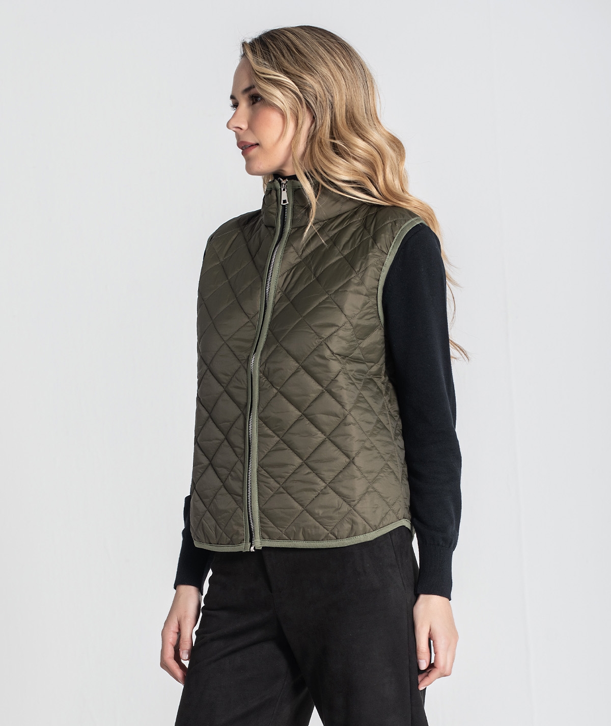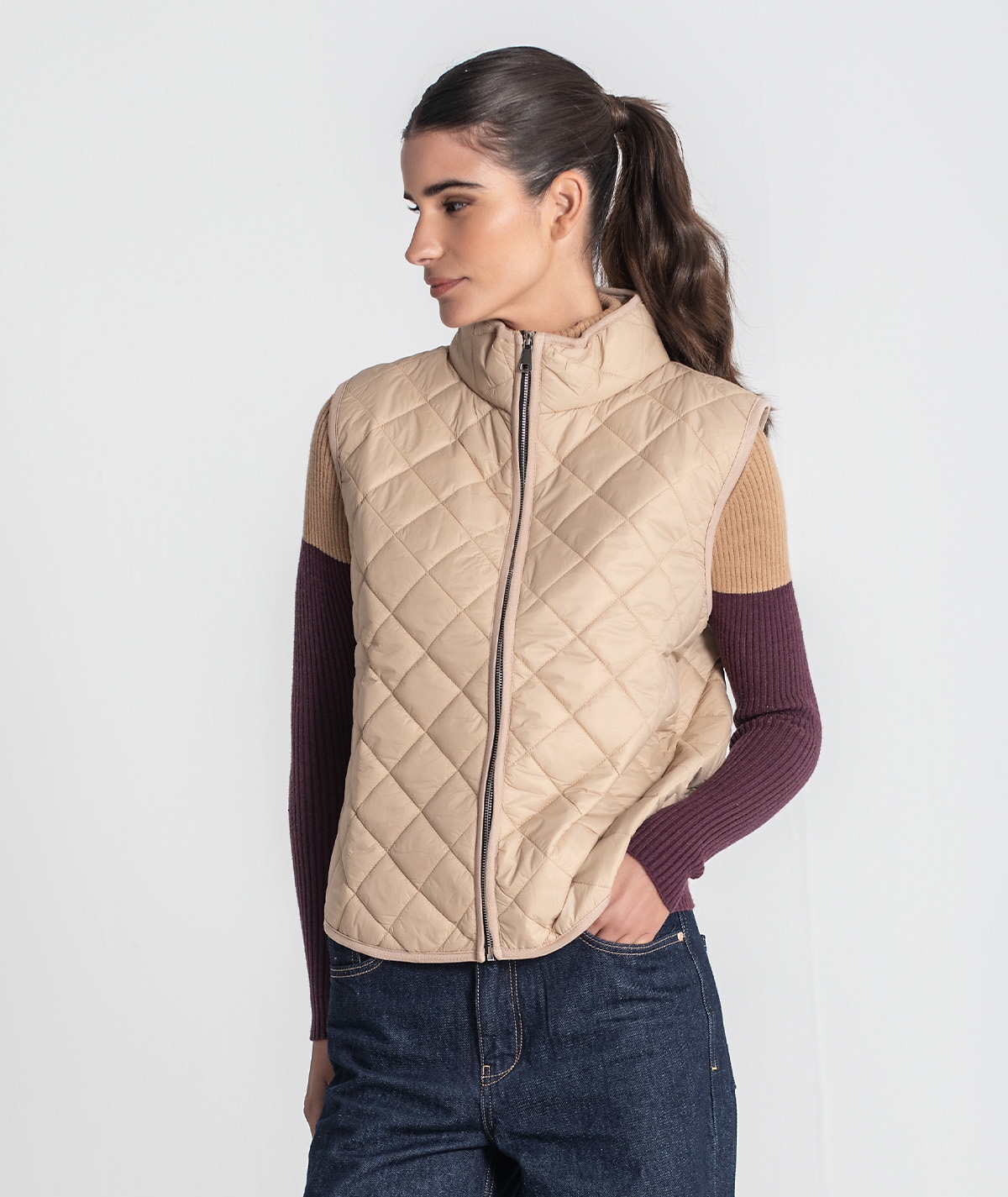 Colete acolchoado curto. Aperta com fecho.