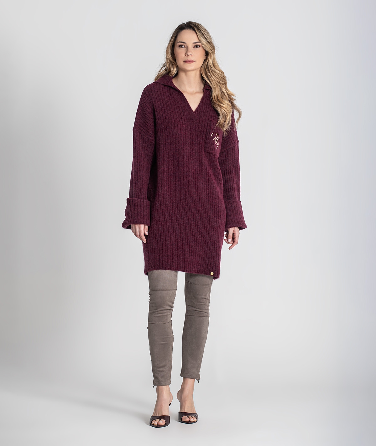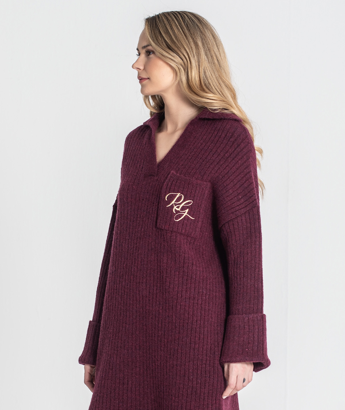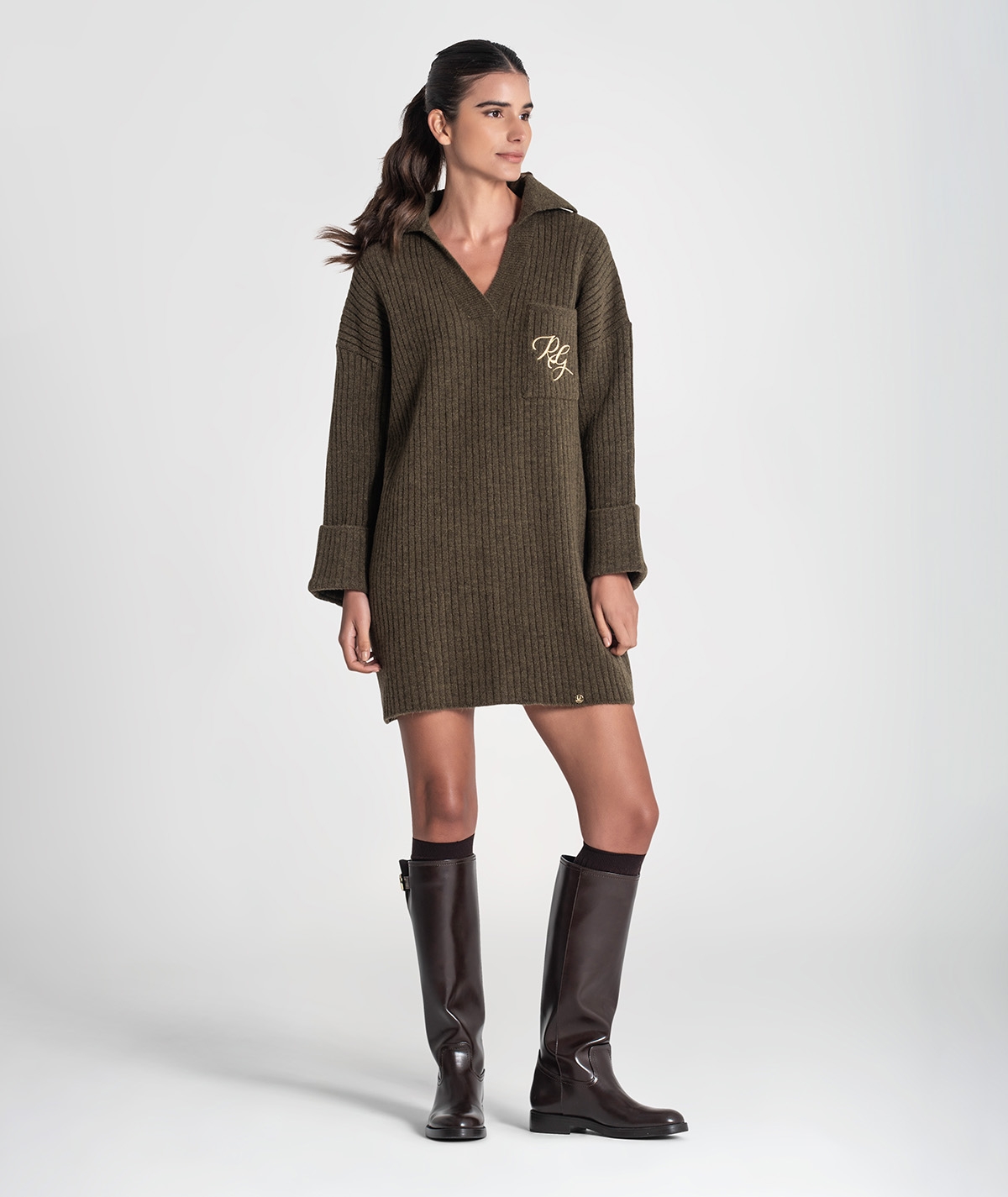 Vestido canelado com bordado “rg” no bolso e detalhe de botões nos punhos.