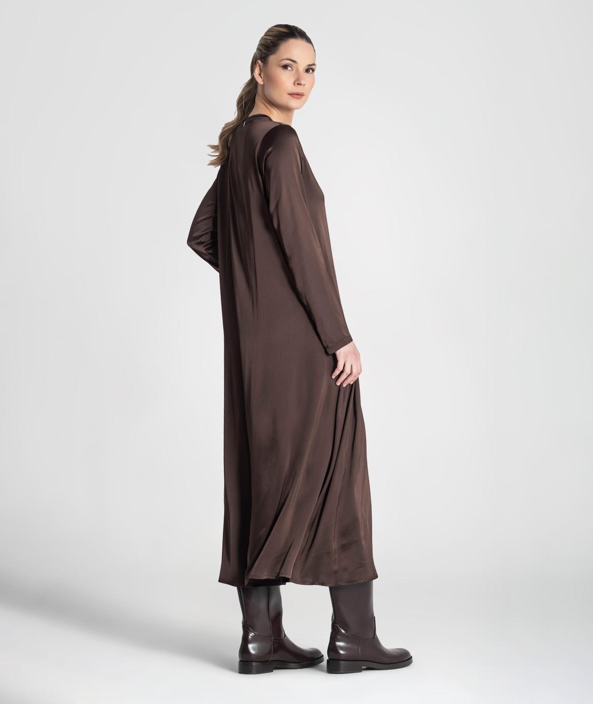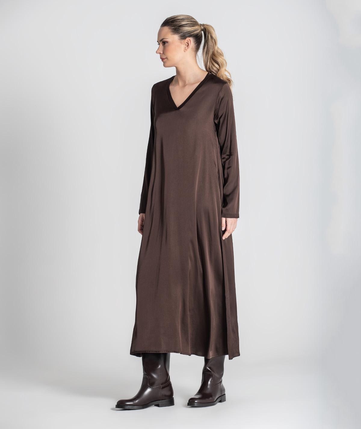 Vestido comprido acetinado com decote em v, de manga comprida.