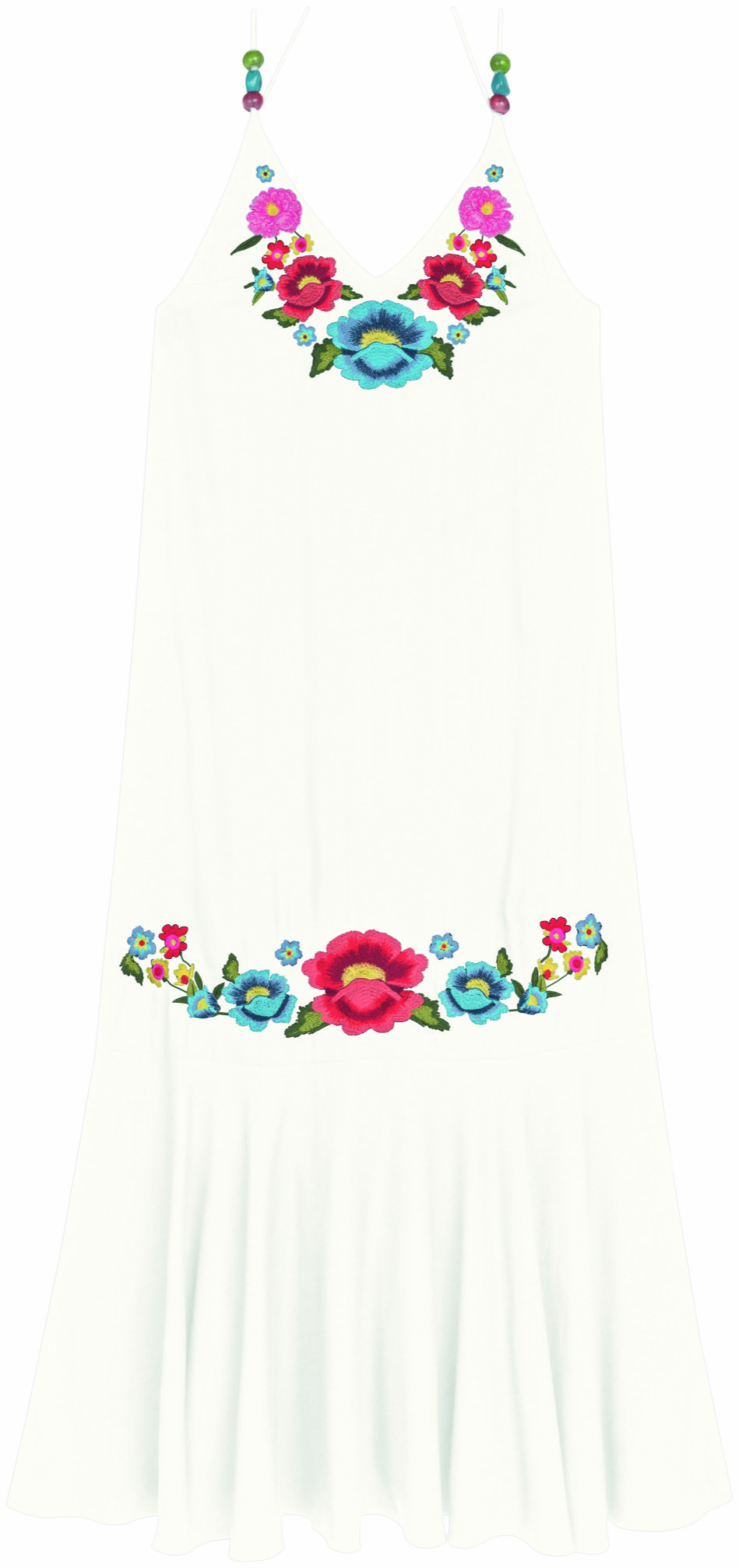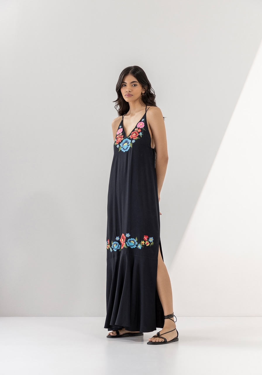 Vestido Comprido C/ Bordado Flores / Pedras Alças