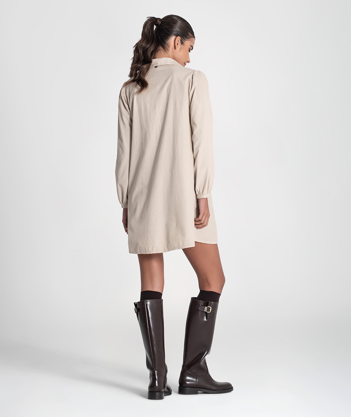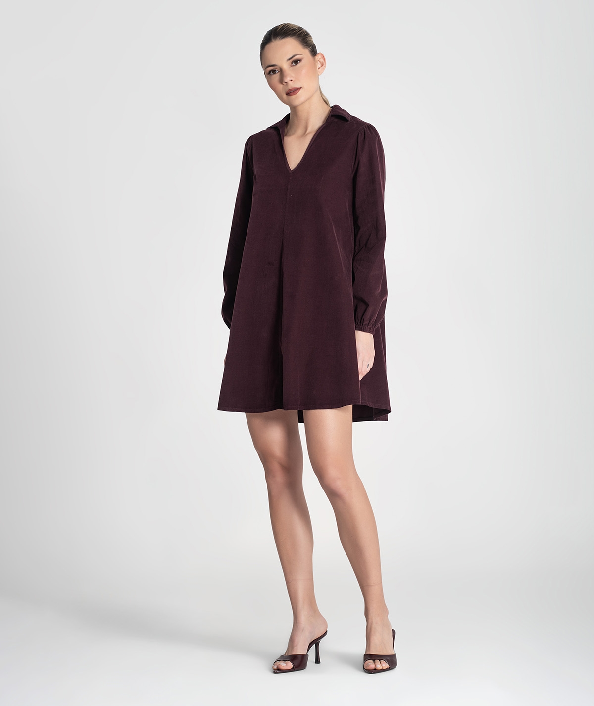 Vestido curto com decote em v e mangas balão, com detalhe de elástico nos punhos.